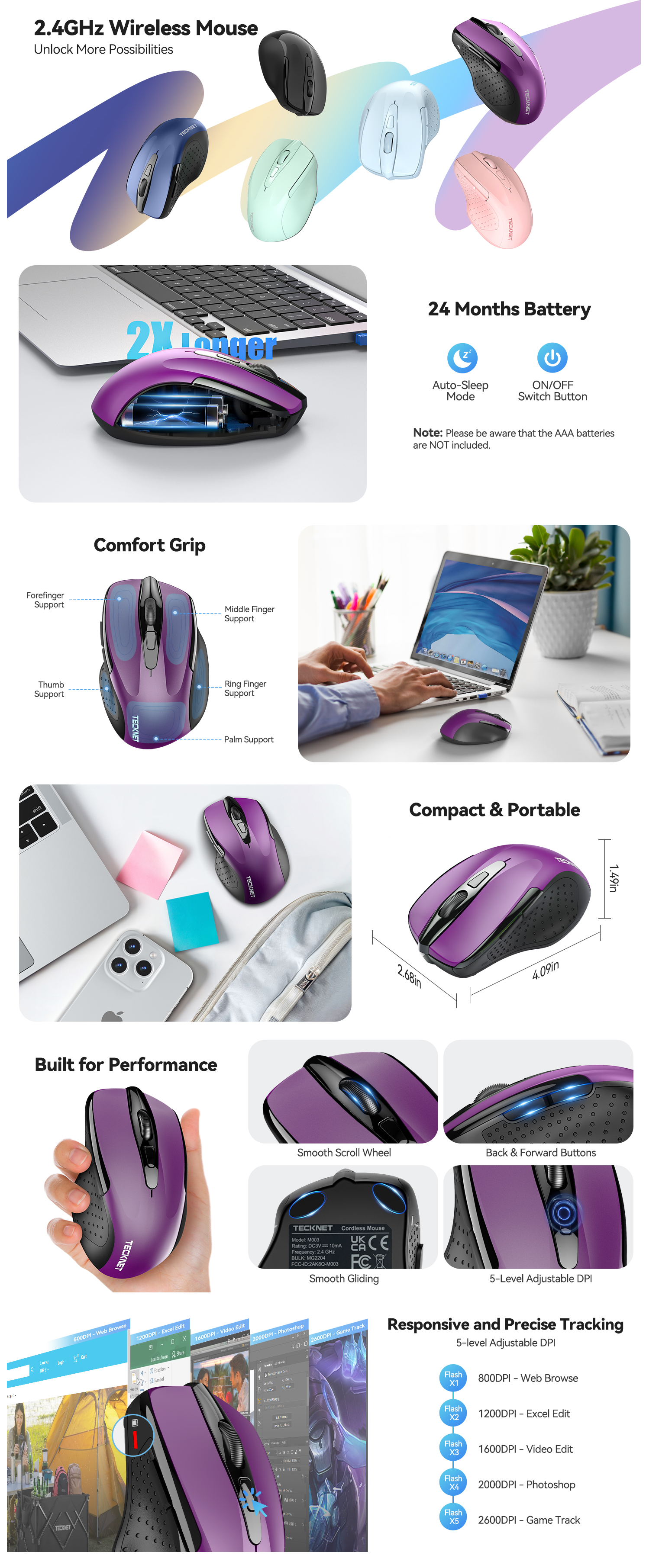 TECKNET Wireless Mouse, 2.4G Ergonomic Optical Mouse, Computer Mouse for Laptop, PC, Computer, Chromebook, Notebook